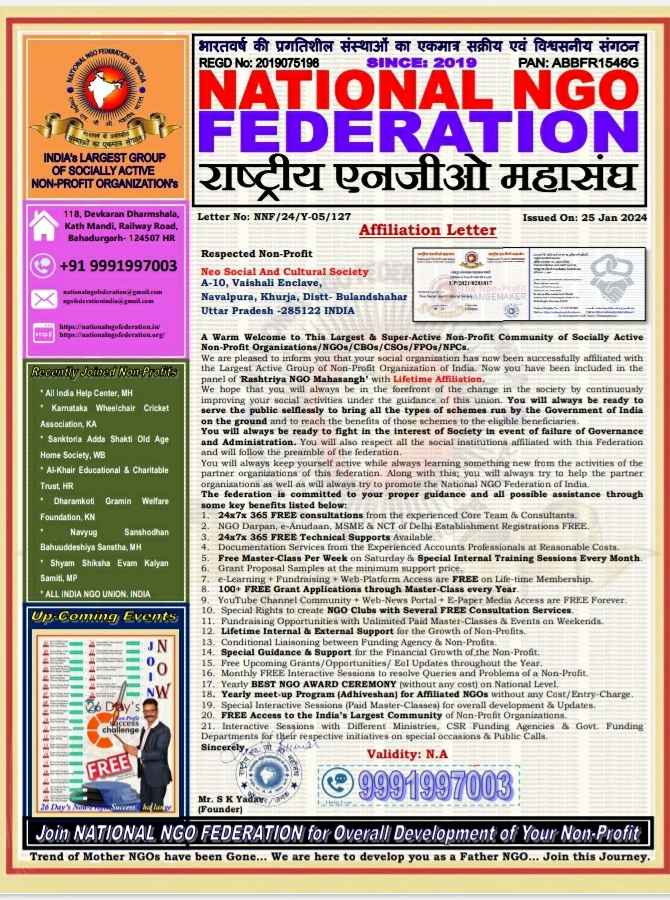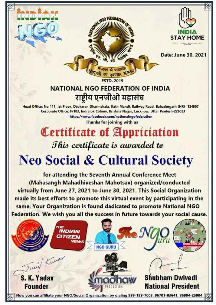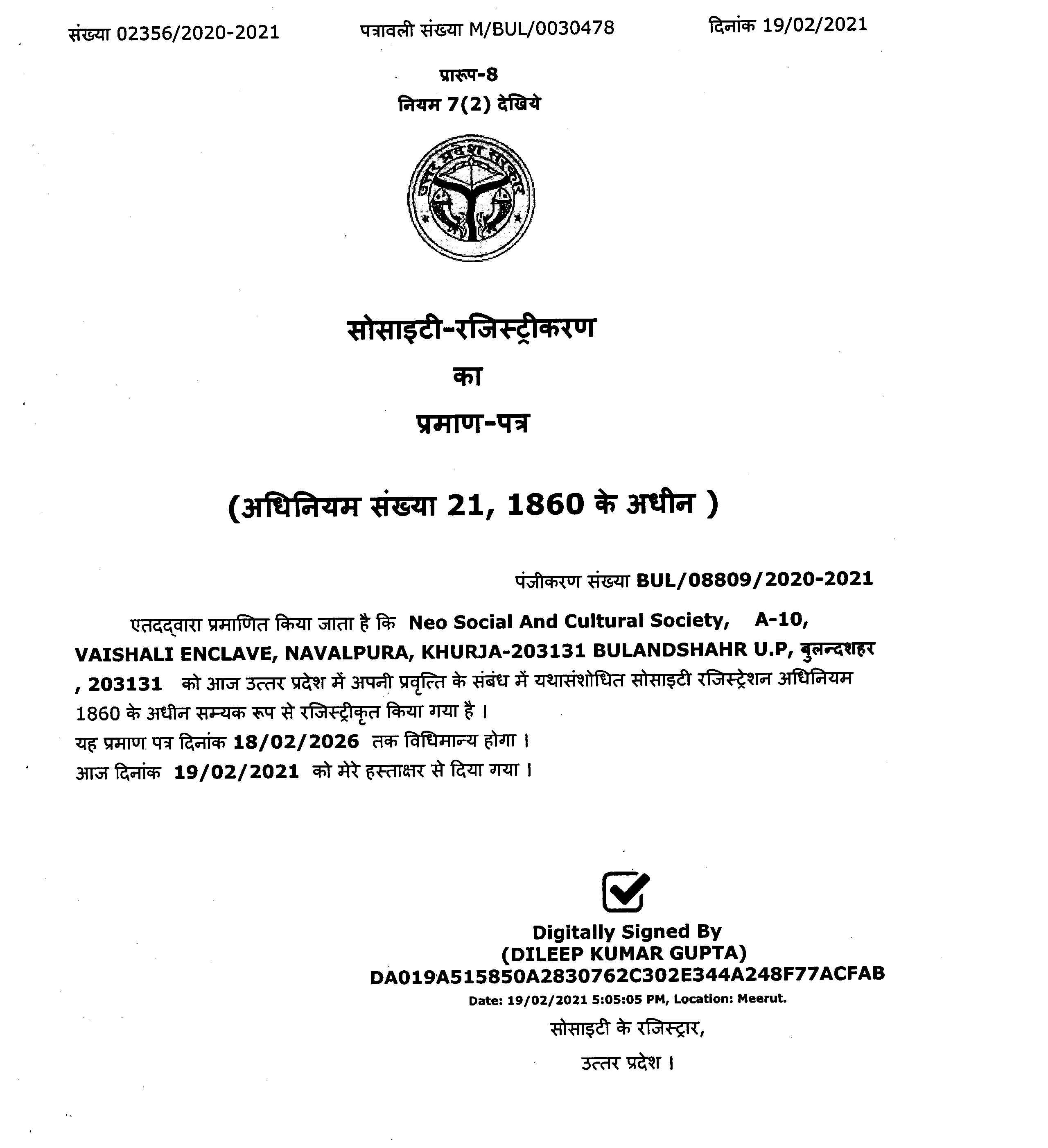 Improve the quality of service they decided to form a registered organization and thus during 2021 Neo Social and Cultural Society was registered under societies registration act 1860 in a formal way. The focus is on the education for underprivileged, healthcare awareness, environmental awareness and cleanliness. The organization also motivates the effluent class to come forward and devote their time and resources to helps the society achieve its goal.